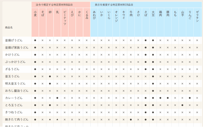 丸亀製麵のアレルギー情報