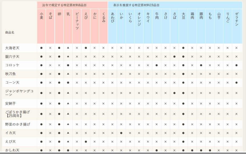 下の写真はスクリーンショットです(これがアレルギー表全てではありませんありません)。