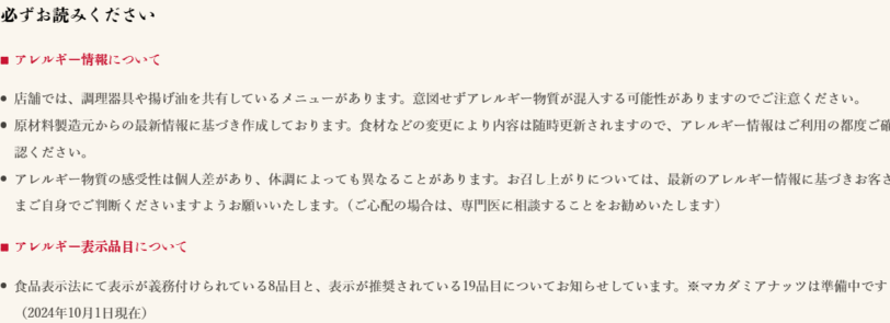 まず、オーダー前にこれが丸亀製麵さんが出しているアレルギーに対する、注意事項。クリックするとページに飛びます。一番上に必ずお読みくださいとあります。↓